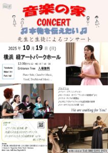 毎年の秋には「音楽の家」の生徒さんと先生方の一緒に「本物を伝えたい」演奏会が行われます。2025年も、やります!10月19日、横浜市、緑アートパークホールで、開場12:40、開演13:00。今年は、いつもより室内楽アシスタントの方々が多くて、室内オーケストラになります!室内オーケストラと一緒にピアノ、バイオリン、歌のそれぞれソロの曲を演奏します。バッハからモーツァルトやクッチーナまで、クラシック音楽の名曲は、頑張っているうちの生徒さんと素晴らしいプロフェショナルの先生方の一緒に演奏でお送りします。